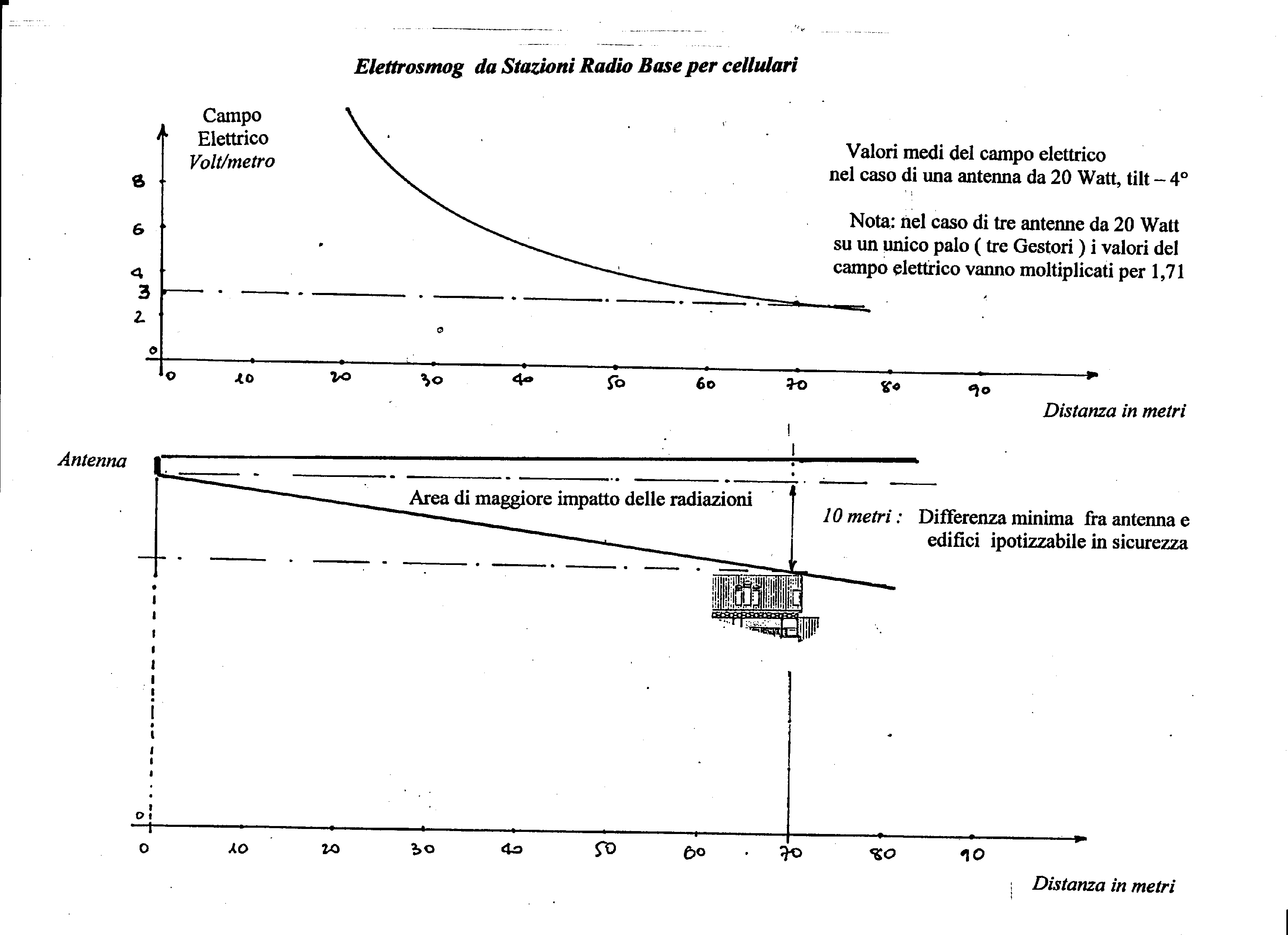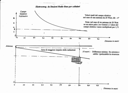 In prossimità di una Centrale  Radio Base, a 10-70 metri di distanza ed entro il relativo conoide di trasmissione, il campo elettrico nelle fasi di  trasmissione può raggiungere valori elevati in relazione ai relativi effetti biologici ipotizzabili. Il diagramma riportato nella pagina seguente  mostra un tipico andamento del campo elettrico da una unica antenna di Stazione Radio Base da 20 Watt nell’ipotesi di assenza di ostacoli fra l’antenna e l’abitato.